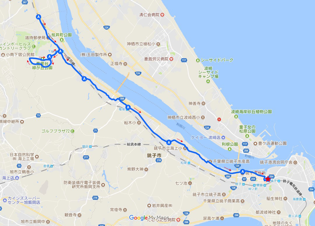 国道356号線を銚子方面に直進し、銚子大橋交差点をそのまま直進。